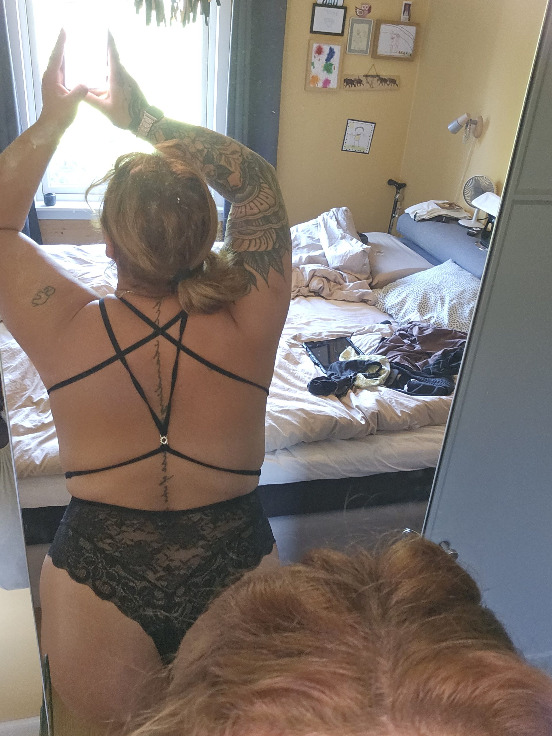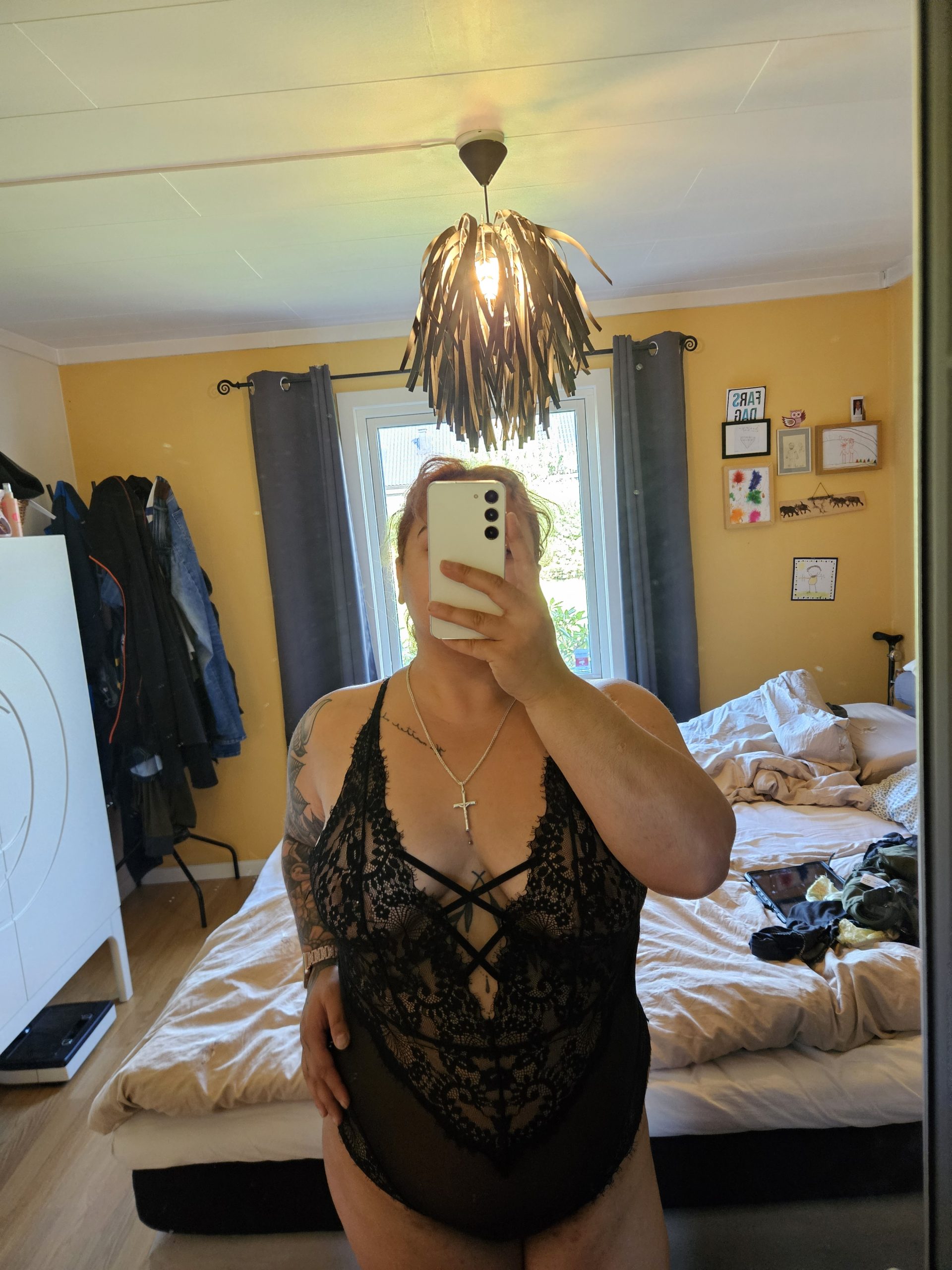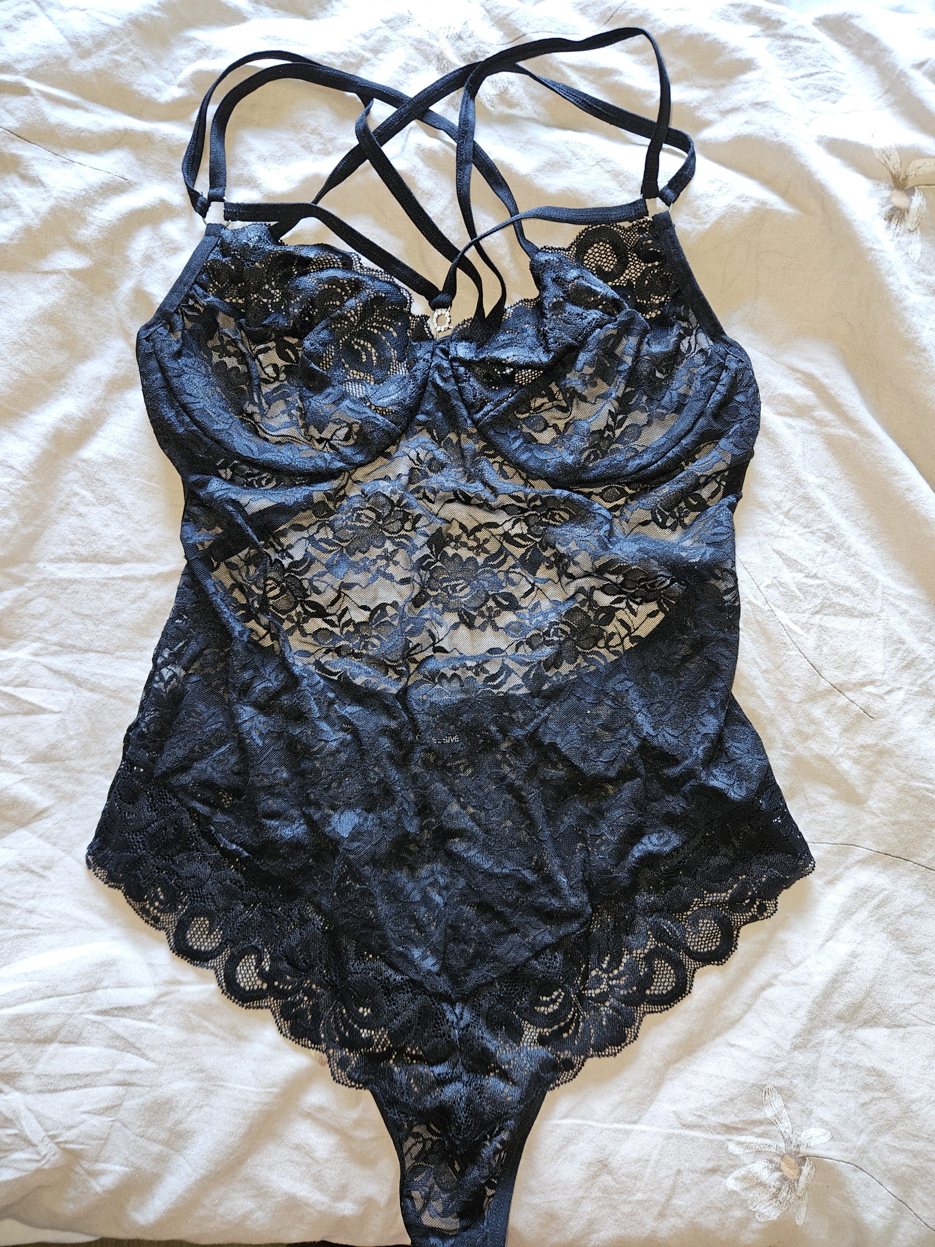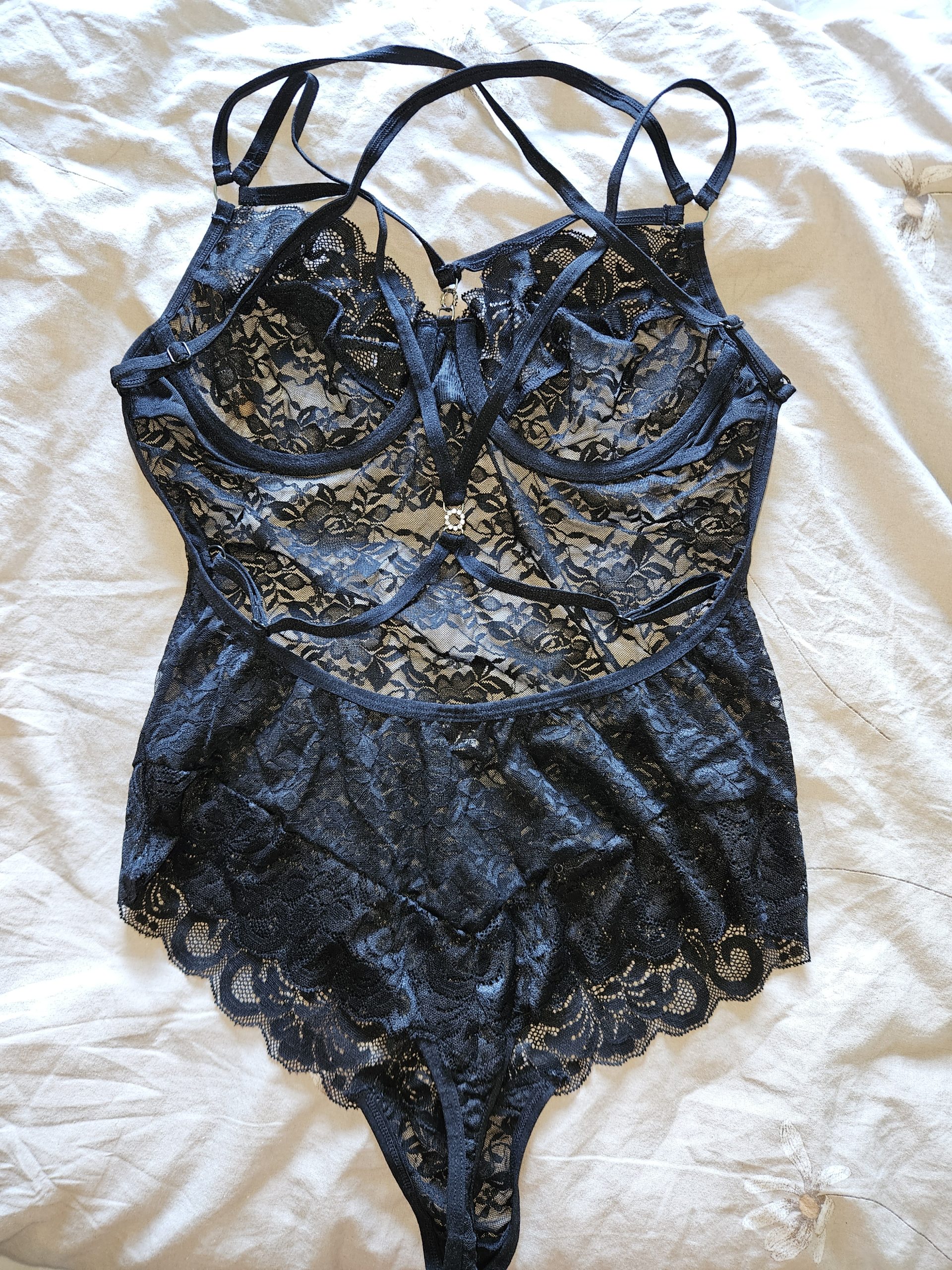 En svart body i spets med lite silverdetaljer här o var. Rikitgt sexig både på och av(;
