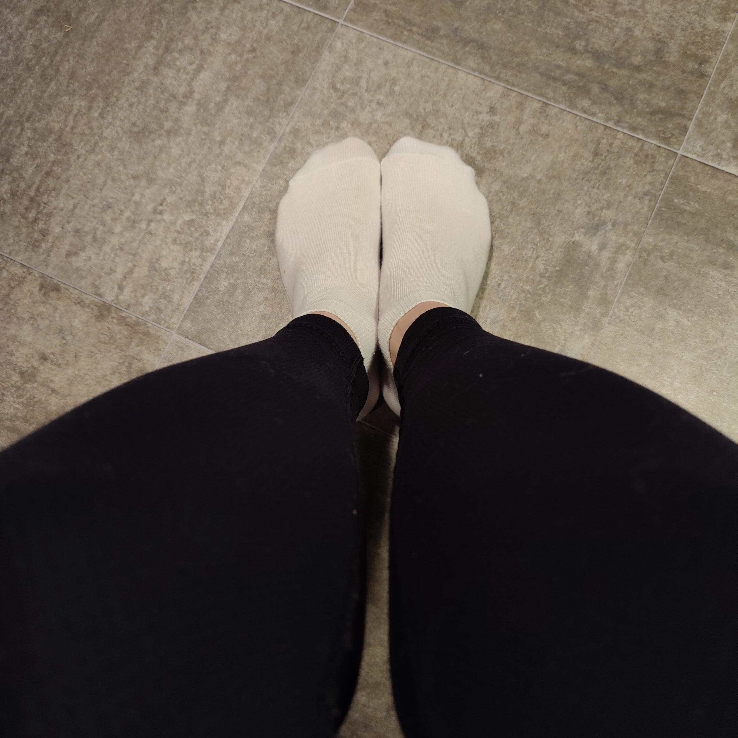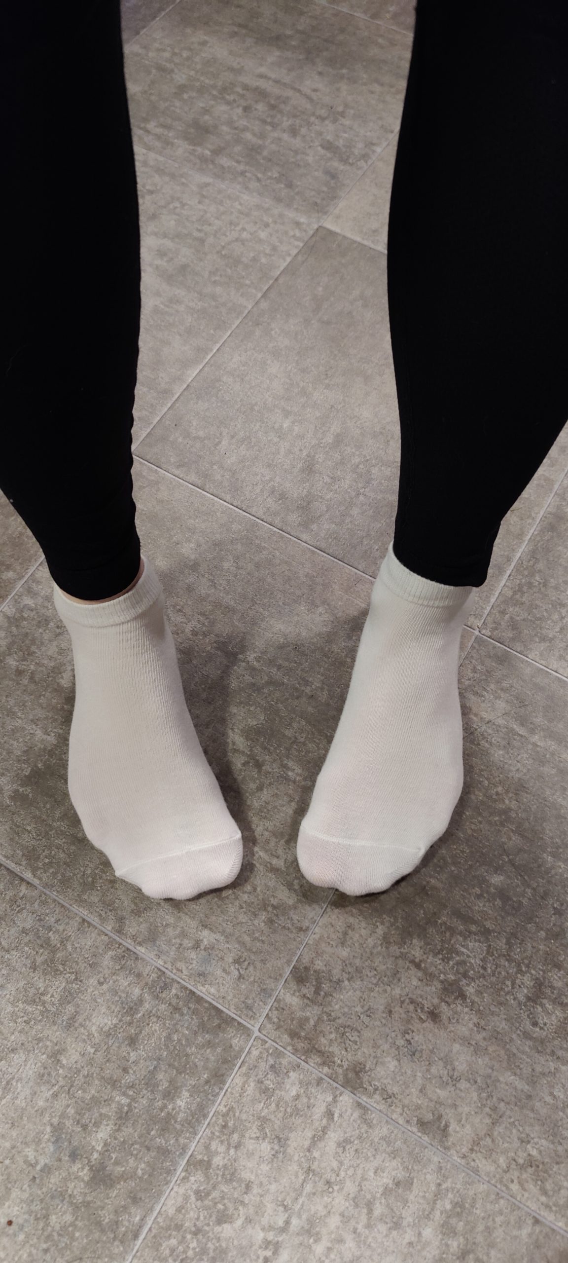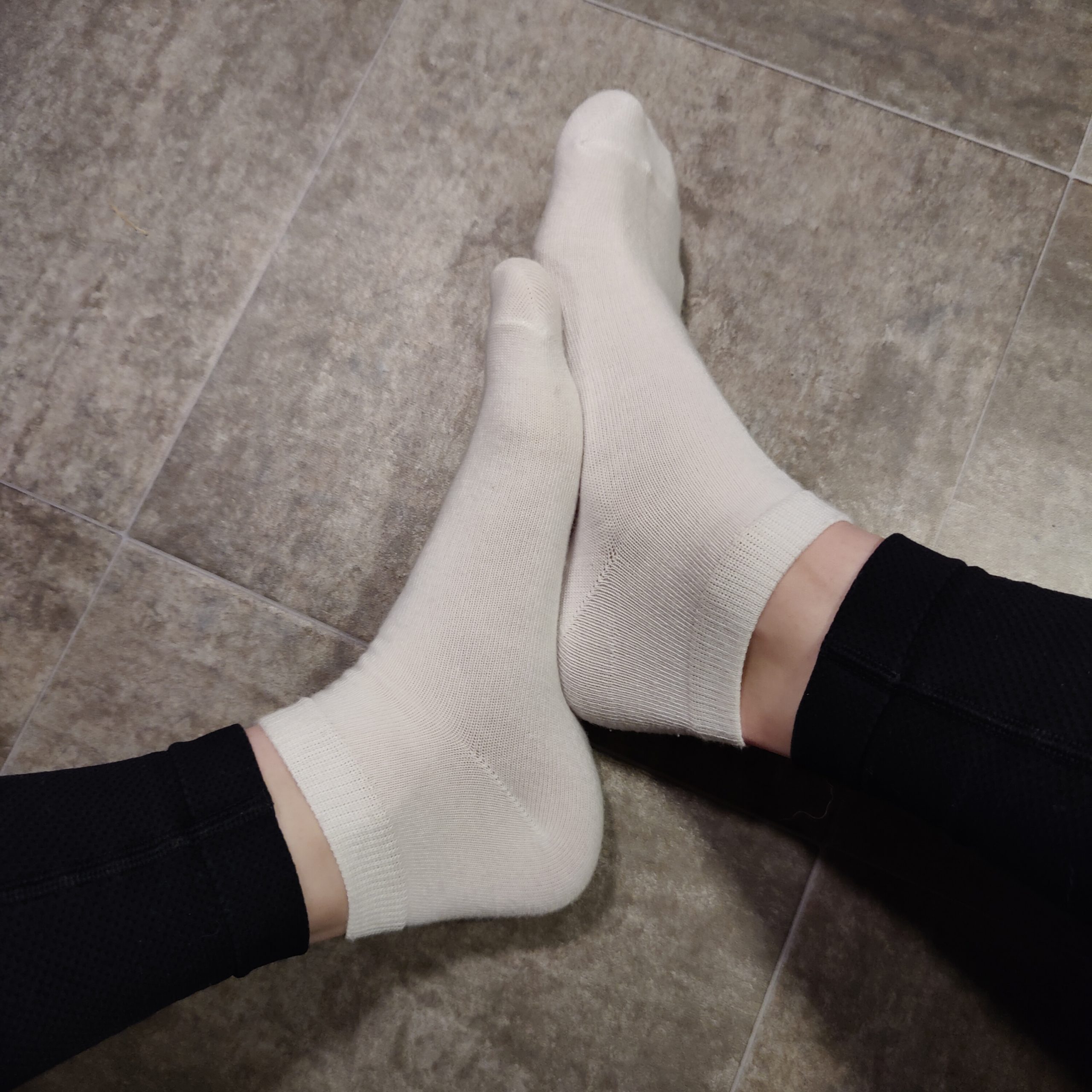 Ett par vita, ankelhöga bomullsstrompor som precis ärades med att få omsluta mina nyduschade fötter.
